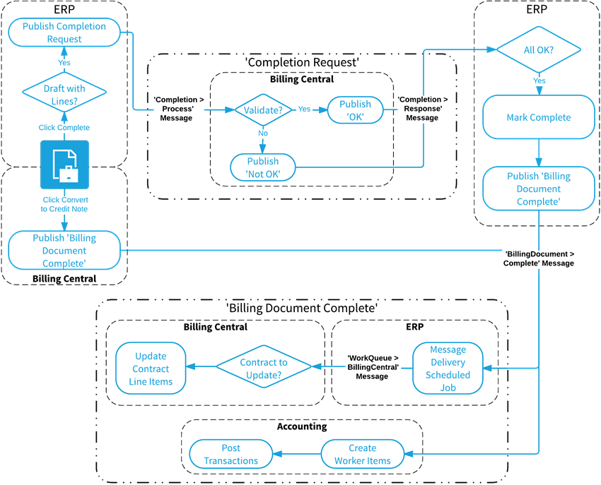 When you click Complete or Convert to Credit Note on a billing document, several messages are passed between ERP, Billing Central, and Accounting.