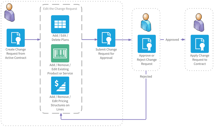 The diagram that follows shows a sample workflow for creating a change request from an active contract and applying it.