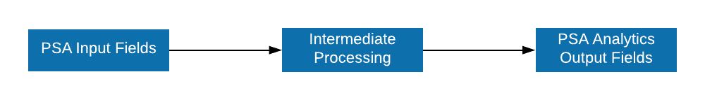 The image below shows the general flow of the data for this dataset. From left to right: the ingested fields from PSA, the calculations implemented, the filtering done to the fields, and the output fields displayed by PSA Analytics. Click on any element of the image to open its detailed information page.