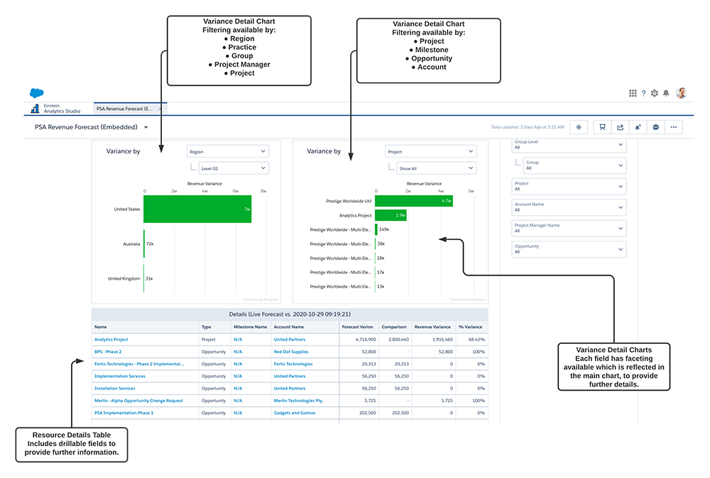 This dashboard is designed to complement the enhanced Services Revenue Forecasting Workspace functionality available in the Fall 2020 release of PSA. For more information on this functionality, see the PSA Help.