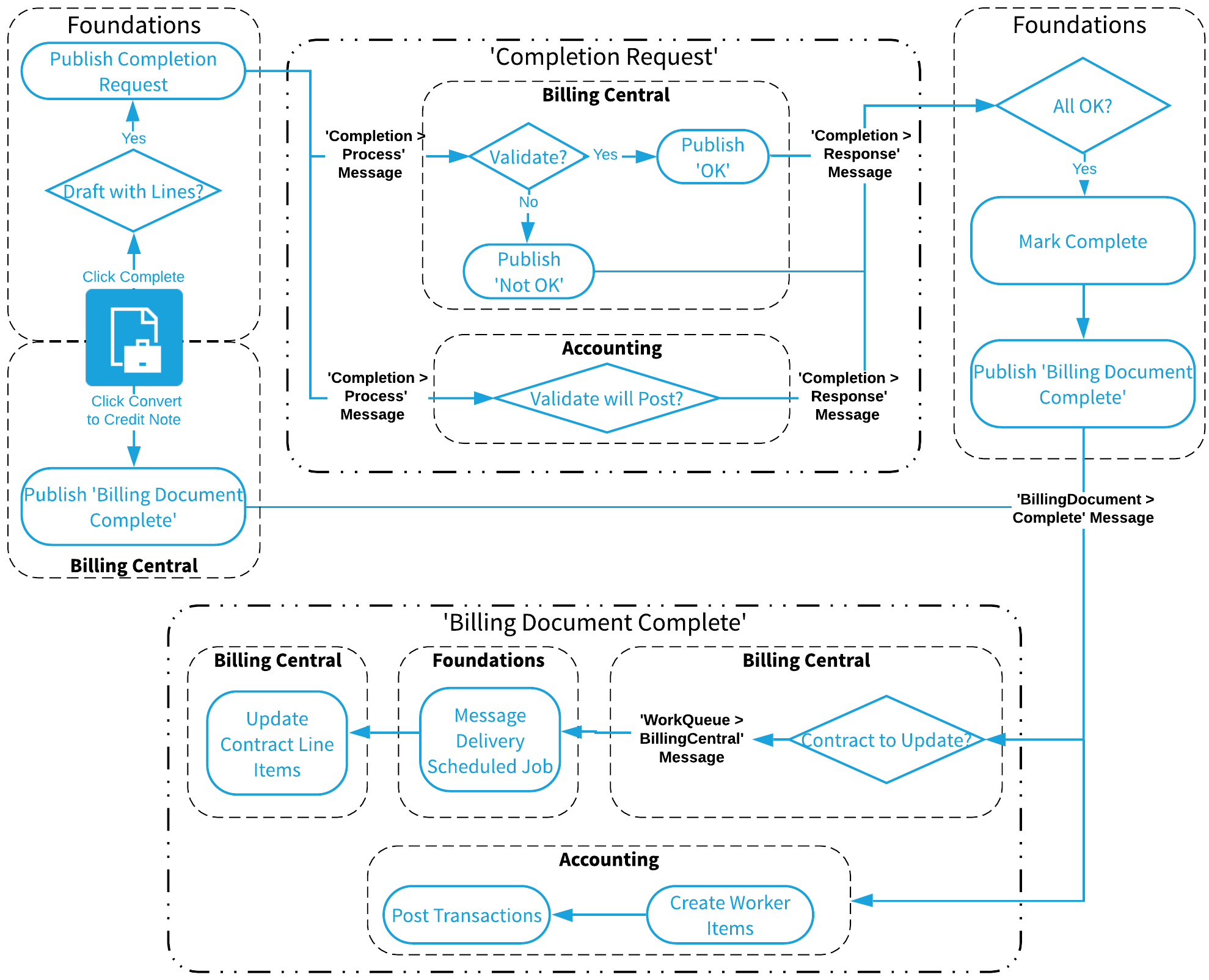 When you click Complete or Convert to Credit Note on a billing document, several messages are passed between Foundations, Billing Central, and Accounting.