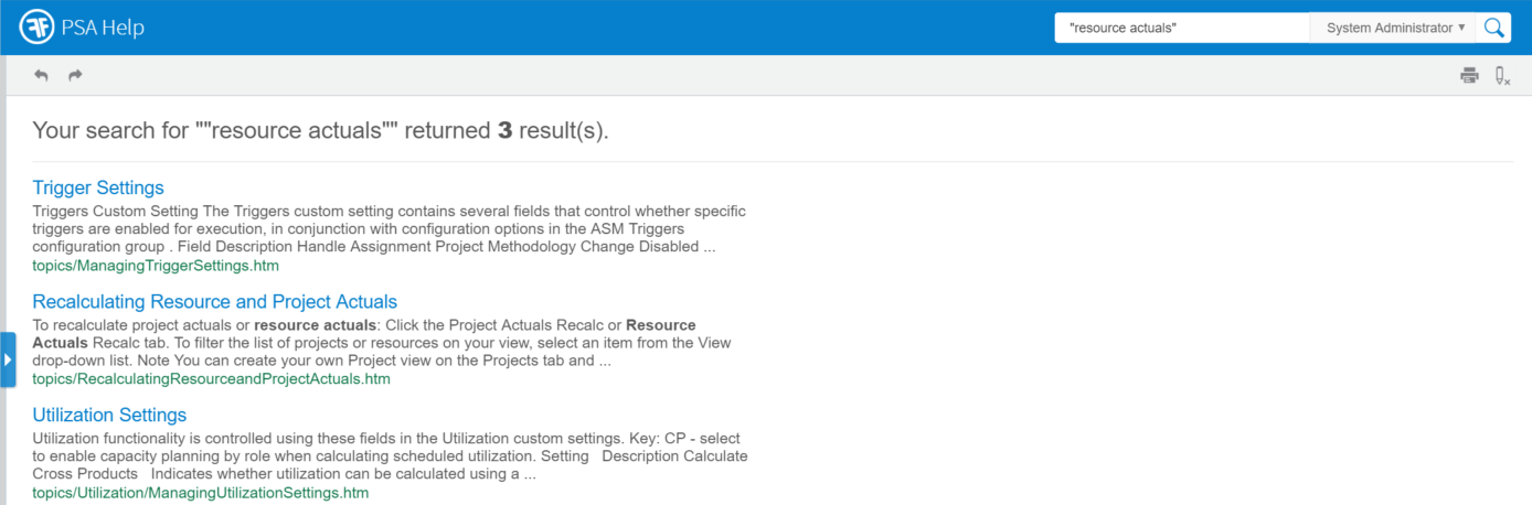 - Type 'resource actuals' into the Search field on the right side of the header. Use double quotes to look for multi-word phrases.