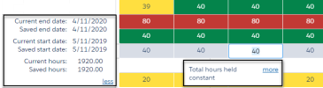 | End date held constant | When you adjust hours, the end date does not change and the total hours is adjusted over the remaining working days. |