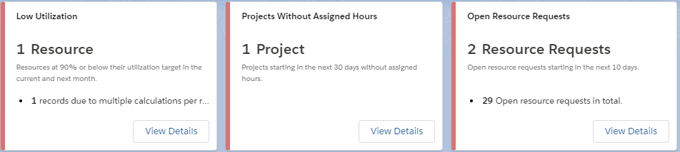 Alerts provide you with information to highlight important details about your assignments, resources, resource requests, and projects. To display a list of detailed records specific to each alert, click View Details.