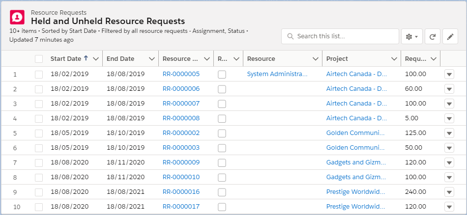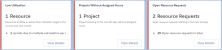 | Held Resource Requests | The count of held resource requests where their status is not "Canceled" with a preferred schedule and without an assigned resource. | Displays the following fields for a list view of held resource requests: