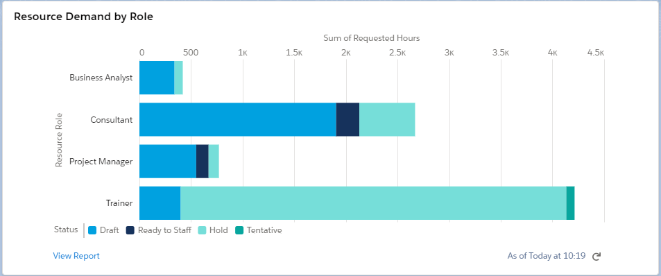 The Resource Management Workspace Report Chart displays a Resource Demand by Role report, summarizing the total number of hours of all unassigned resource requests, per all resource roles. Resource requests with the status of “Assigned” and “Canceled” are excluded.