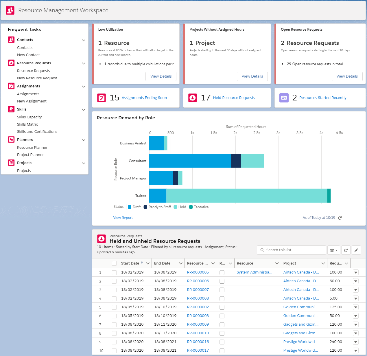 The Resource Management workspace acts as a starting point for the activities that you conduct in your resource manager role. Data for all resources is displayed in the org.