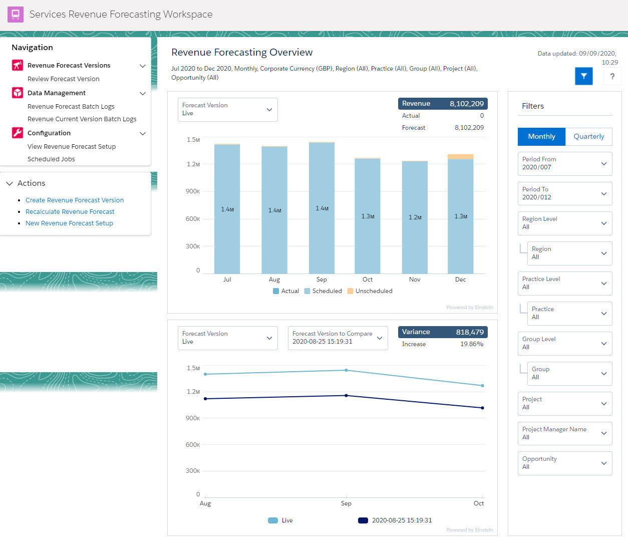 The Services Revenue Forecasting workspace acts as a starting point for the activities that are relevant to Revenue Forecasting in PSA.