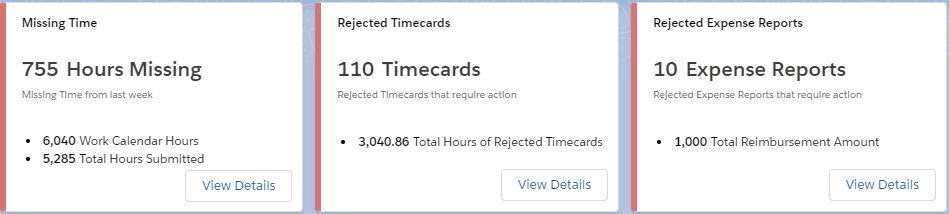 Alerts provide you with information to highlight important details about your missing time, rejected timecards, and rejected expense reports. To display a list of detailed records specific to each alert, click View Details.