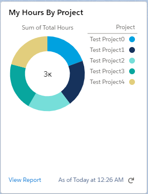 The Time and Expense Workspace Report Chart displays a Timecards report, summarizing the total number of hours off from projects you are assigned to.