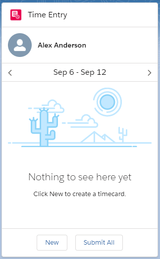The Time Entry component displays a list of your timecards. Time Entry enables you to quickly access related content. To display a list of detailed time entries specific to each timecard, click individual timecards. To create a new time entry, click New.![]()