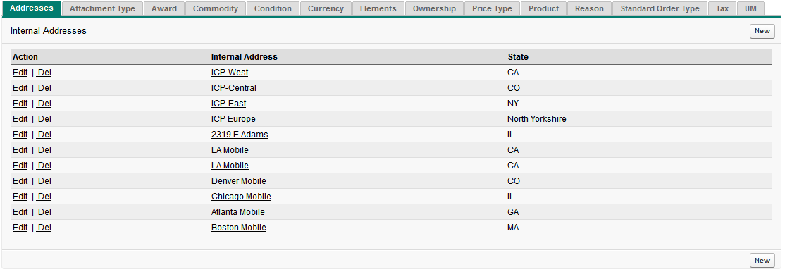The Addresses tab within the codes tab contains the internal address records for ICP