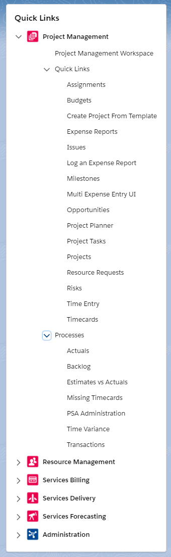 The Navigation pane also provides links to our FinancialForce business process models (BPMs). These models are a visual representation of process flows in PSA. For example, a BPM takes you through the steps for creating a project from an opportunity. To open the Create Project From Opportunity BPM, in the Navigation pane, under Processes & Flows, click Create Project from Opportunity.