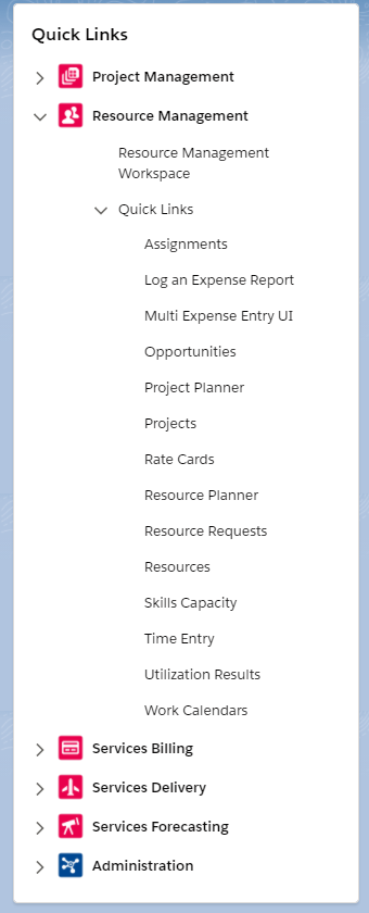 The Resource Management links enable you to navigate to the most frequently accessed pages that are relevant to your role.