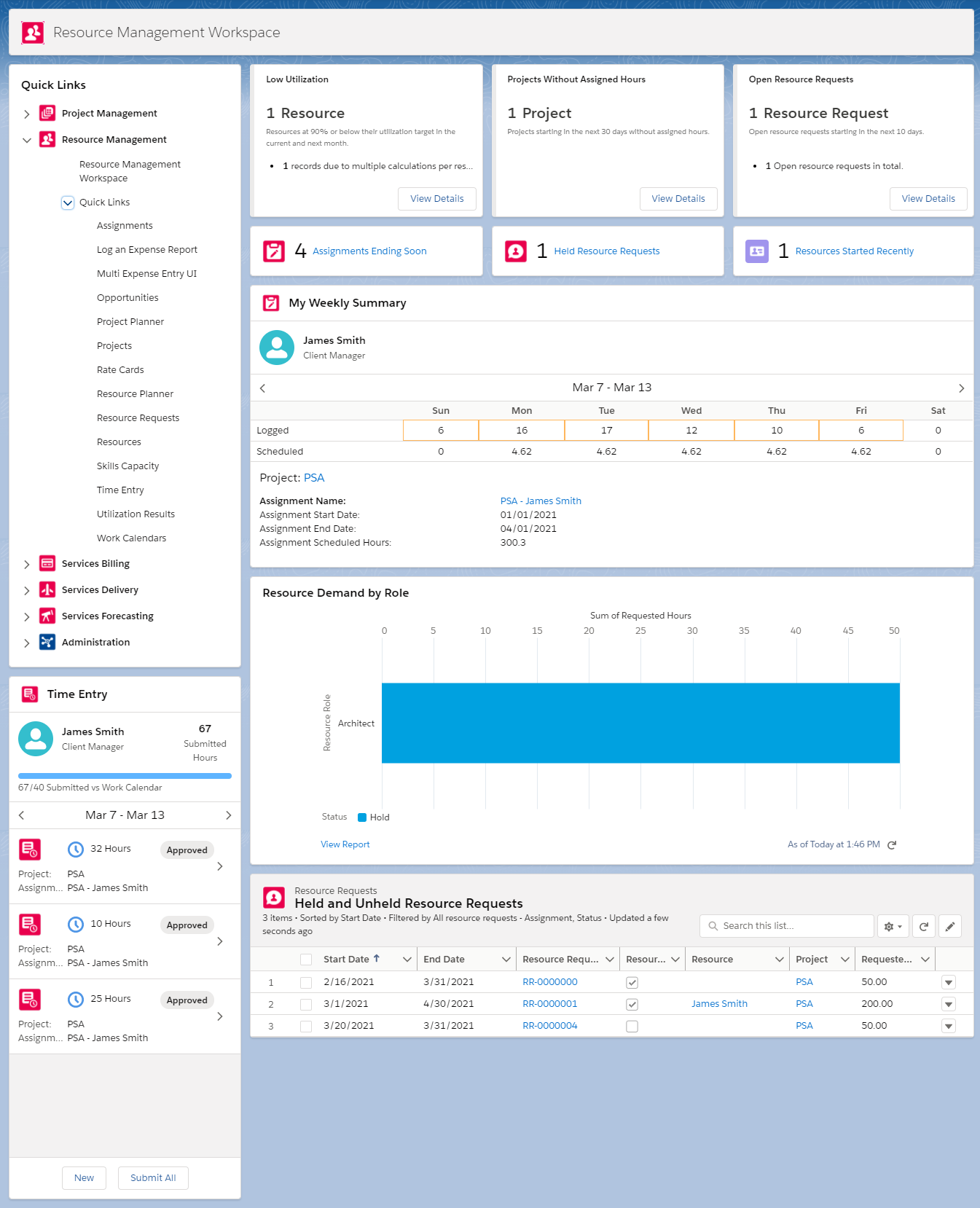 The Resource Management workspace acts as a starting point for the activities that you conduct in your resource manager role. Data for all resources is displayed in the org.
