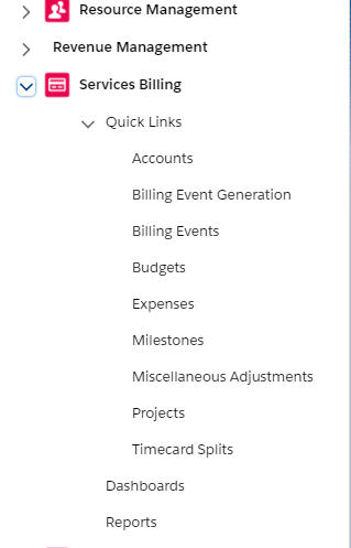 The Services Billing links enable you to open the pages that are relevant to your role.