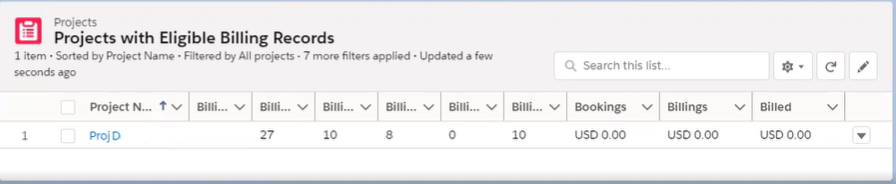 The Project List View displays a list of your projects with eligible billing records. You can use the controls in this view or click the title to open the list view page.