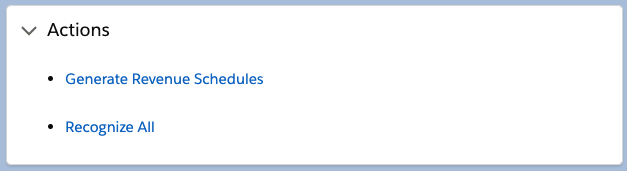 The option to generate revenue schedules in bulk is accessed from the RM Actions Lightning component. The following steps assume that the RM Actions Lightning component is available on the Revenue Management Home Page, but it is also available from the Revenue Management Workspace.