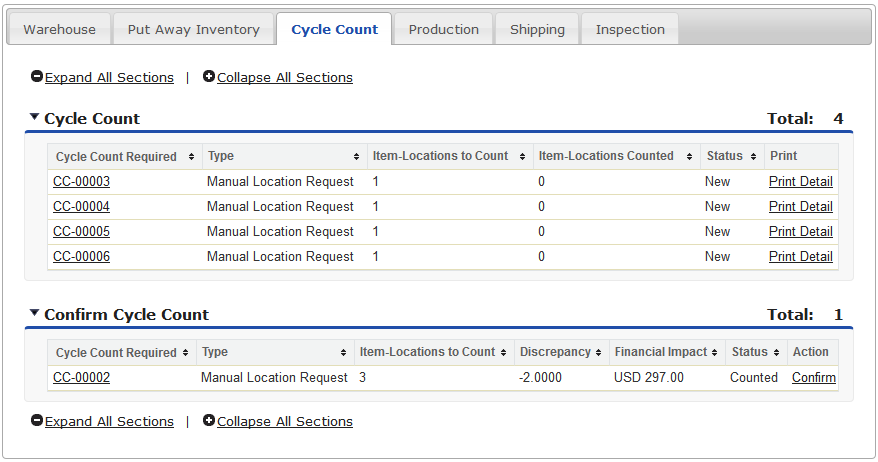 The Cycle Count tab lists the cycle counts that have been initiated. From the Cycle Count tab you can print the details of each cycle count