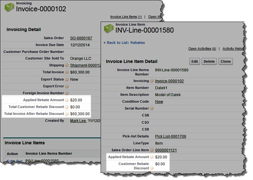 When a sales order is shipped, rebates that have been applied to the sales order are included in the invoice along with the rebate discount to be passed to the customer.
