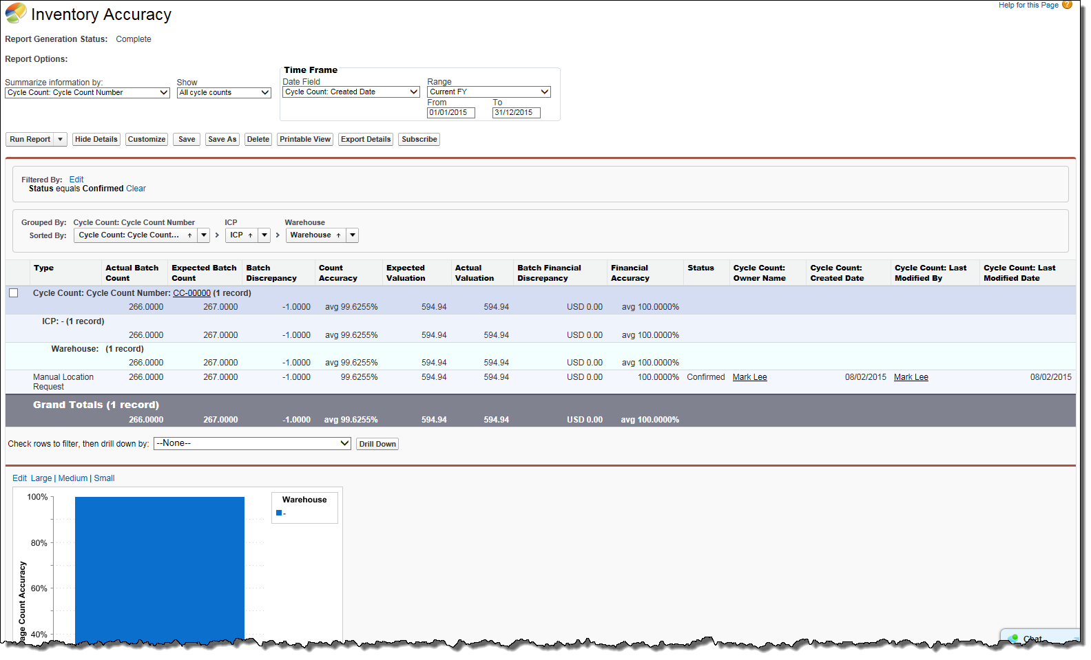The Inventory Accuracy report enables you to evaluate the accuracy of the record of inventory in your warehouses against cycle counts.