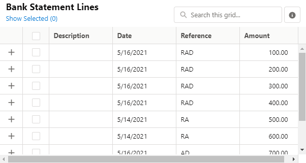 - [Optional] To find a specific value, date, description, or reference for a bank statement line enter search text in the box above the grid in the Bank Statement Lines column.
