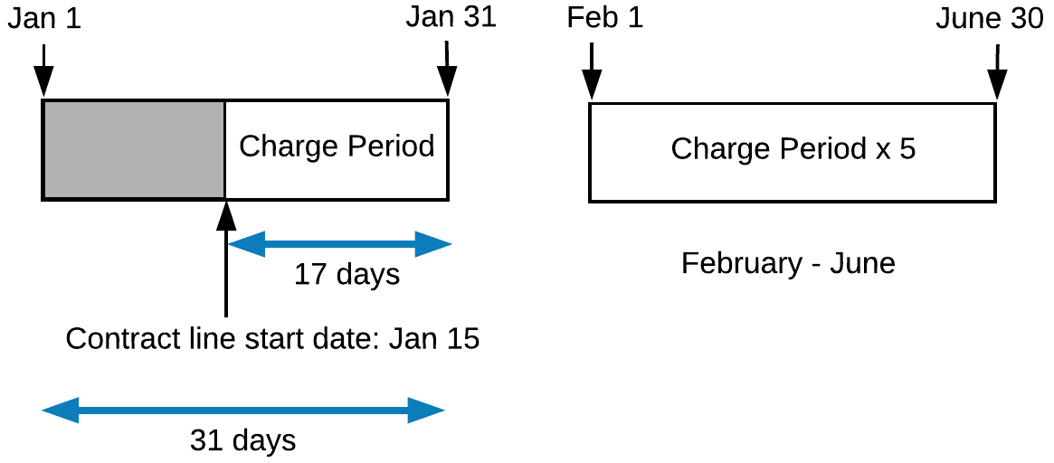 If the first charge period is a partial period, the amount charged for the first charge period will be prorated according to the proration policy assigned to the contract. For example, let's assume that the discounted contract line item above starts on January 15 2022. The MB (month beginning) charge term means that the charge periods will be January 1 - January 31, February 1 - February 28, March 1 - March 31, and so on. If the contract is using Actual Days in Period proration, the amount charged for the first period will be for the 17 of the 31 days in January that the contract line item was in use so the calculation will be 1900 * (17/31) = 1041.94 when rounded to two decimal places. The amount billed for the first half year will be the partial period amount plus five whole periods: 1041.94 + (5 * 1900) = 10541.94