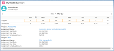 The My Weekly Summary component provides a weekly view of status for all your associated projects, assignments, and project task assignments.