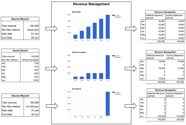 - When the template type is Deliverable, the source record's total revenue is recognized on delivery. So when the Total Revenue is 100,000 and the source record is active for six months, 100,000 is recognized on the delivery date at the end of the six months.