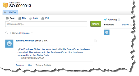 When you cancel the purchase order a Chatter notification will be sent to your sales department informing them that the purchase order for the related sales order line (or lines) has been canceled.