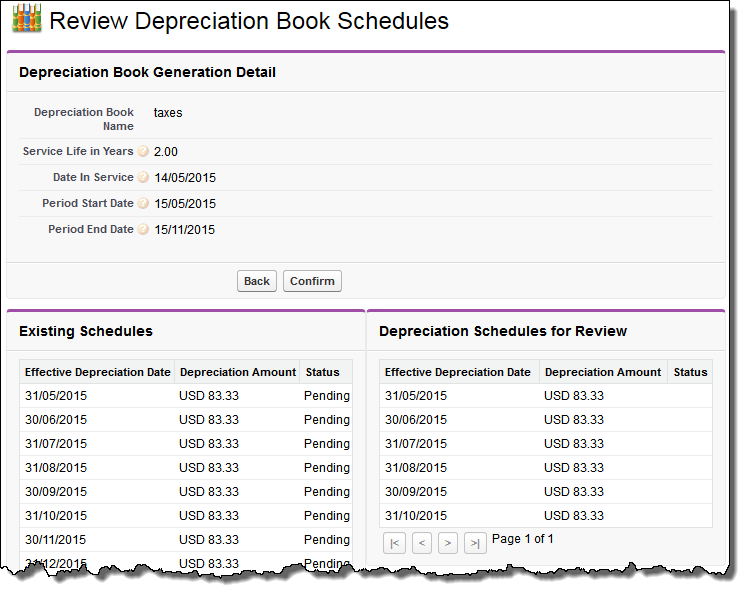 - To change the proposed depreciation schedules, click Back, make the changes you want on the depreciation book and repeat the last two steps.