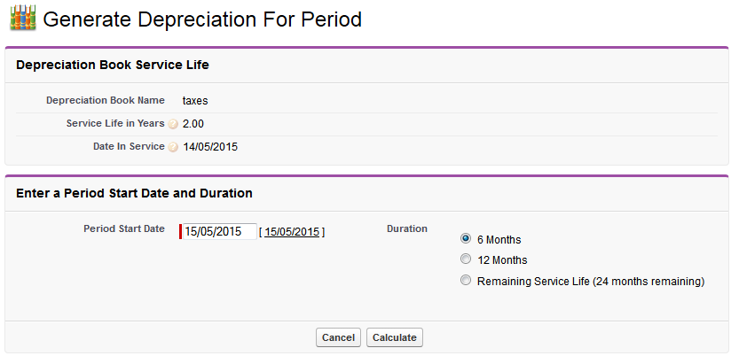 - In the Period Start Date field, enter the date on which depreciation is to be calculated from. You must enter a period start date that falls on or after the Date in Service, but before the end of the service life. There must not be any gaps in the depreciation schedules.