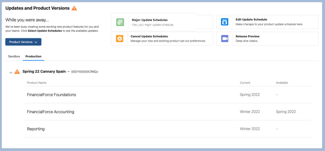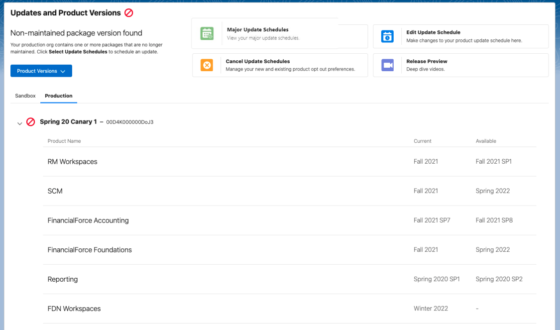 When a package is three or more versions behind the latest version, it is no longer maintained by FinancialForce. In the product versions section, a