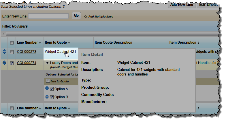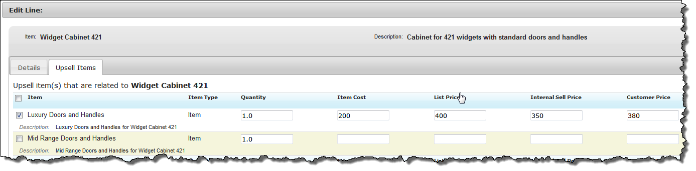 When you add an items that contains upsell items, these are shown in the customer quotation line depending on the options your administrator has set and the way in which the item master has been configured.