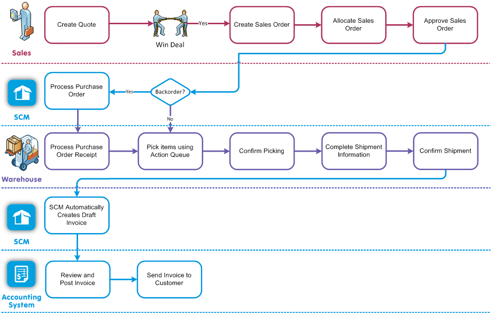 A backorder is also created when an item on a sales order is a manufactured kit and requires a production activity to be carried out on it to turn it into the finished product., items are picked to create a shipment, the shipment is sent to the customer. An invoice is then generated in SCM and sent to the accounting system for posting to the company financials and the customer.