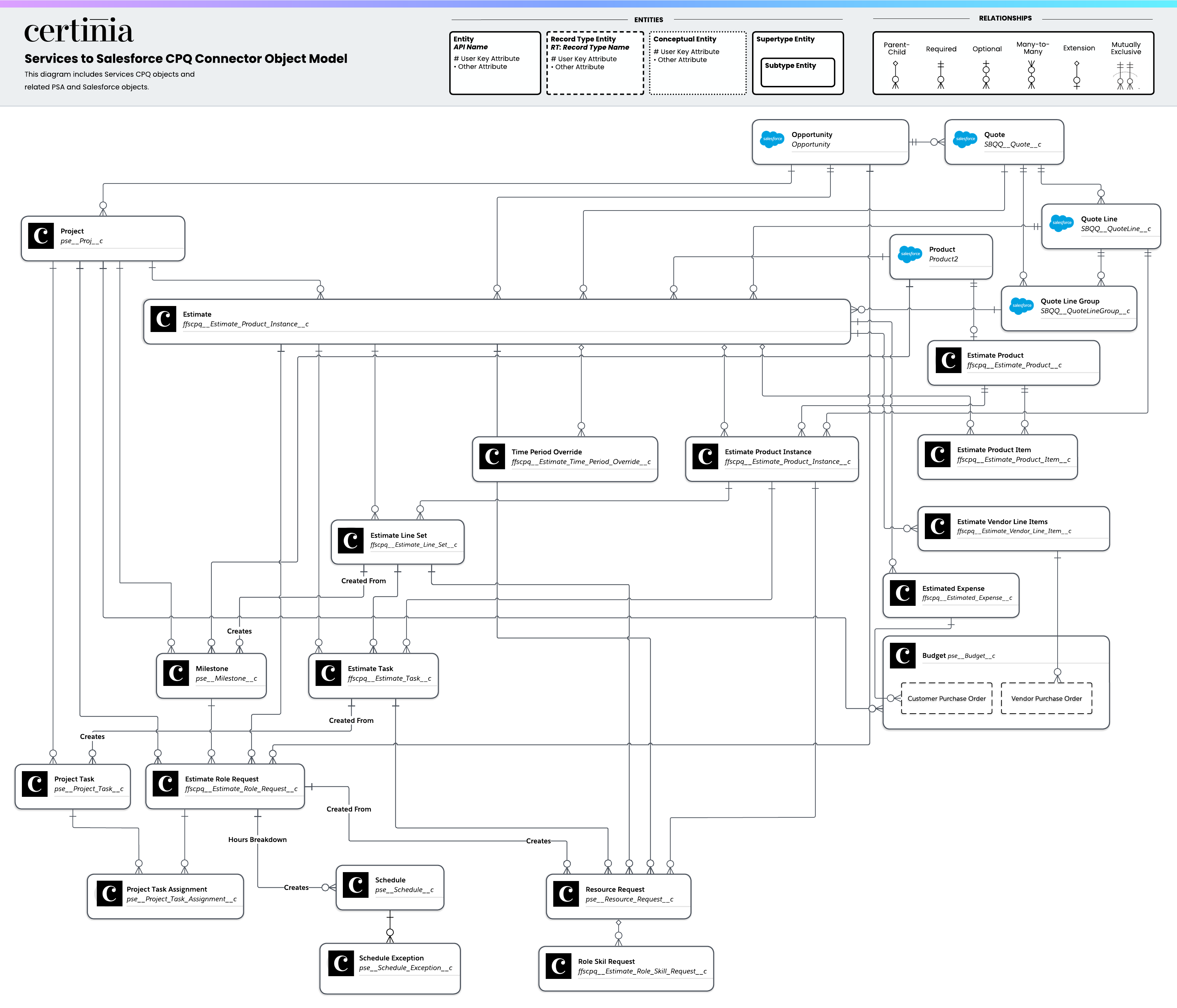 This entity relationship diagram (ERD) illustrates the relationship between objects in Services CPQ, PSA, and Salesforce objects. Certinia's ERDs use crow foot's notation. For more information, see "About Entity Relationship Diagram Notation" in the Salesforce Help.