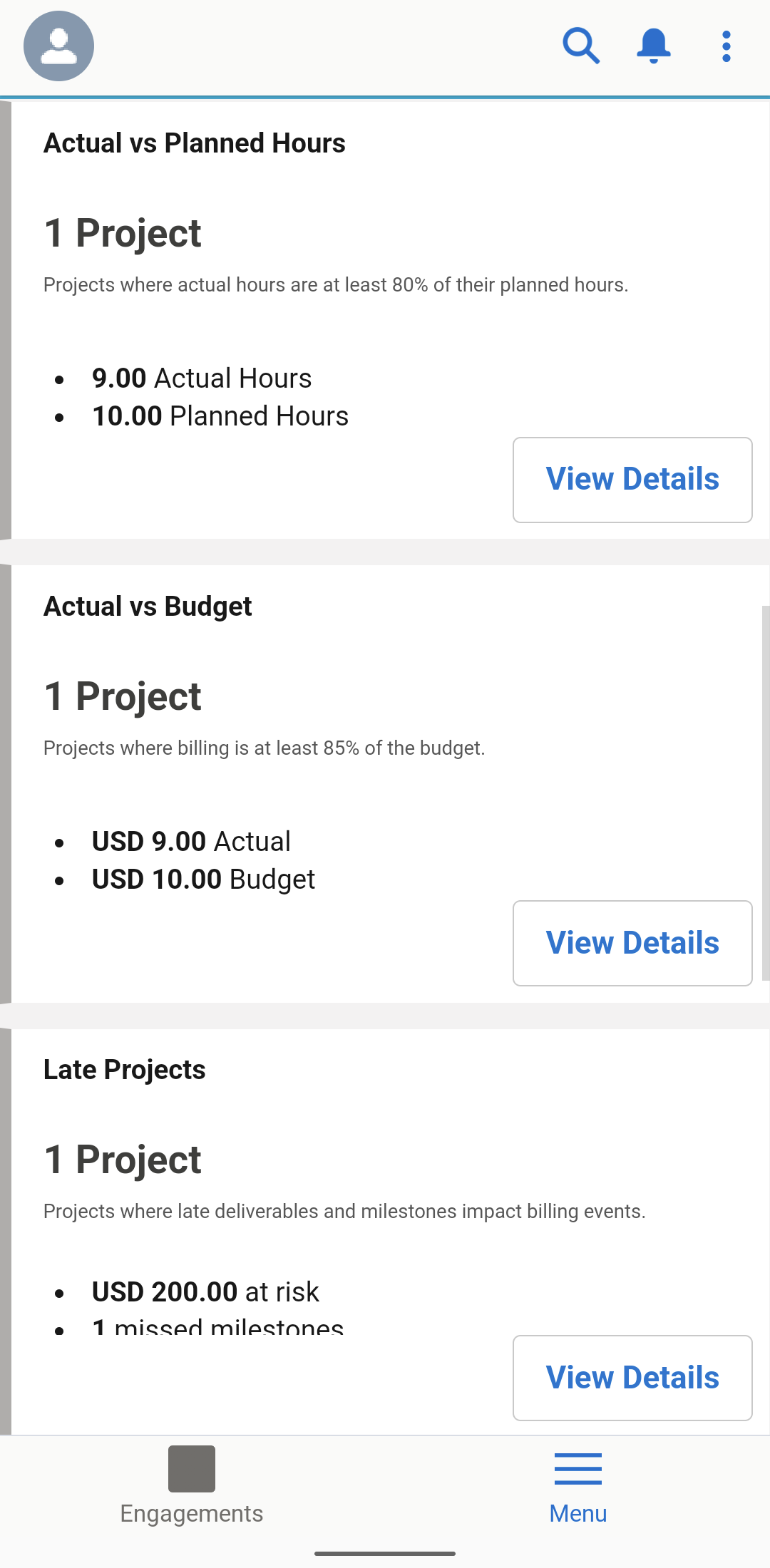 | Late Projects | The aggregated value of your projects at risk of running late, and the count of projects with late milestones impacting billing events, and the count of missed milestones across the counted projects. | Displays a list view of late milestones associated with your projects. |