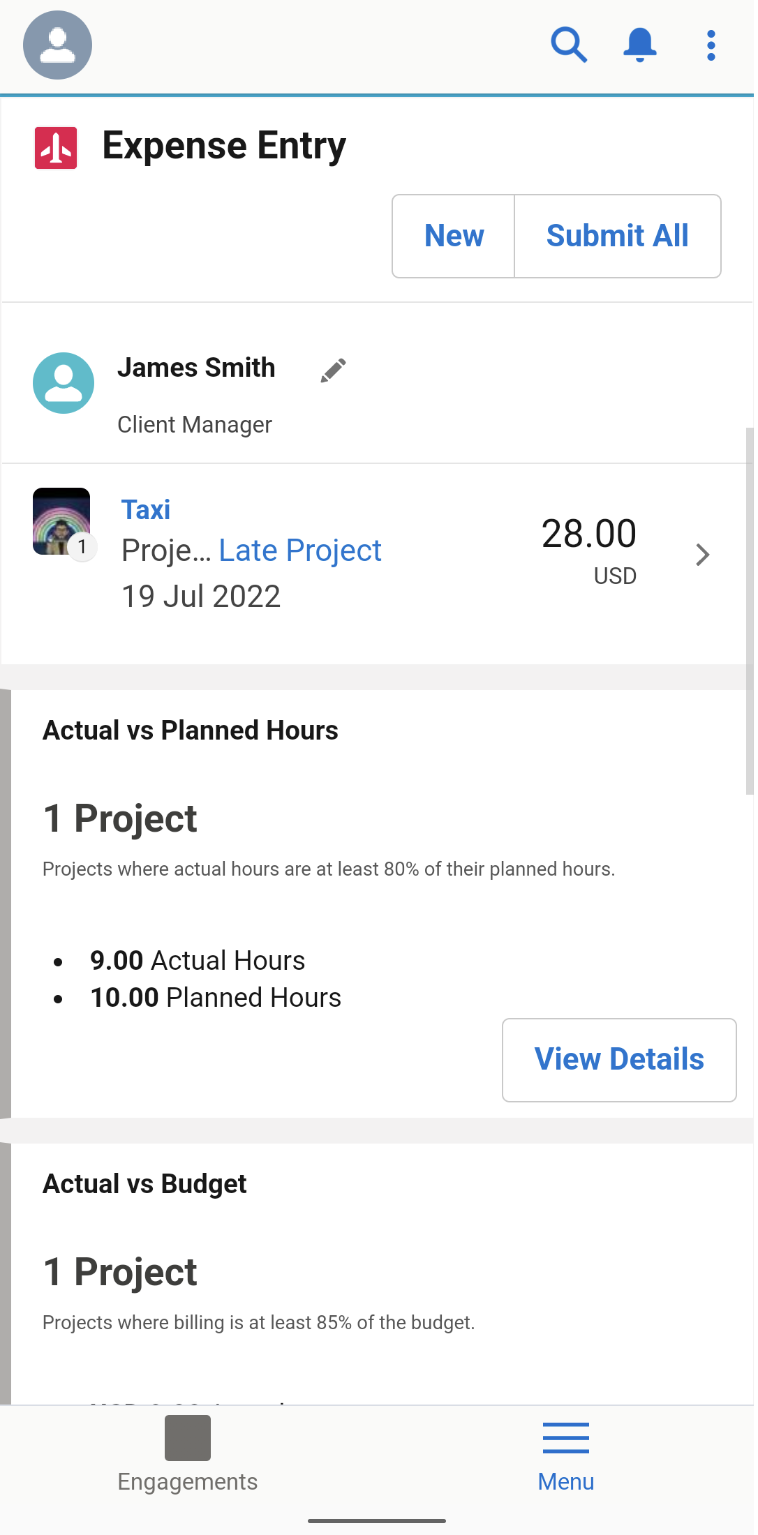 | Actual vs Budget | The count of your projects where billing is 85% or greater than the project budget, and the aggregated value of actual and budget including expenses across the counted projects. | Displays a list view of your projects that are close to their budget. |