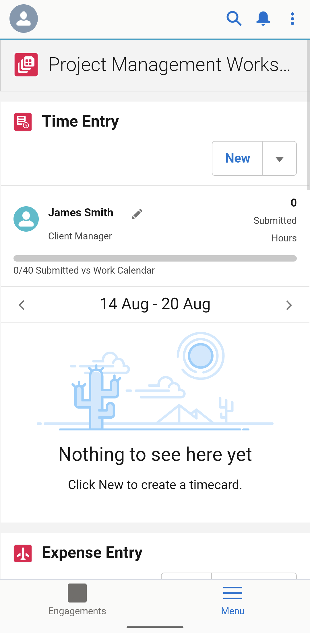 The Time Entry component displays a list of your timecards and enables you to create new ones.