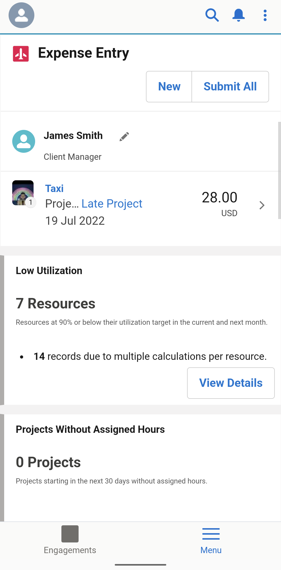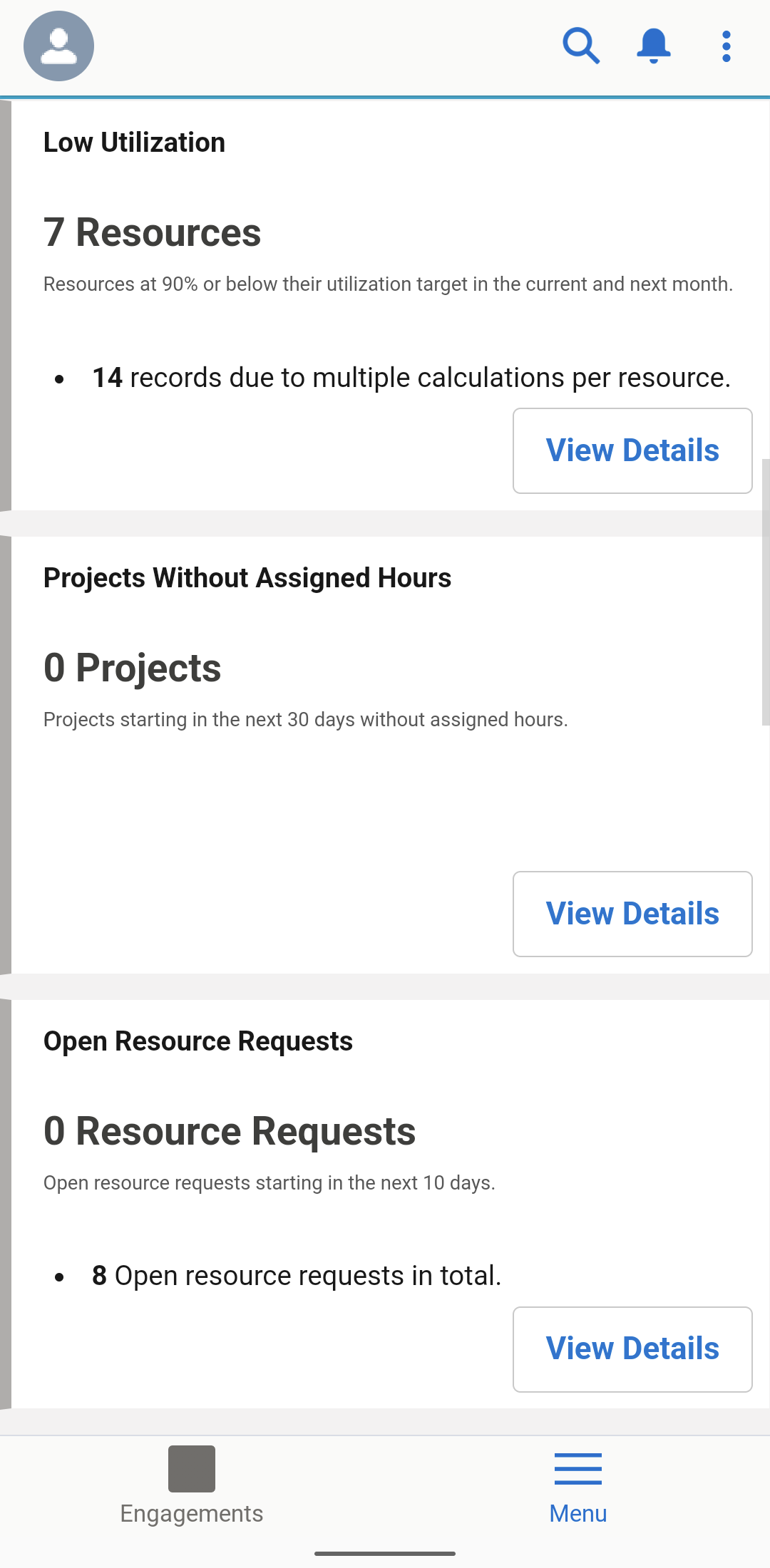 Alerts provide you with information to highlight important details about your assignments, resources, resource requests, and projects. To display a list of detailed records specific to each alert, click View Details.