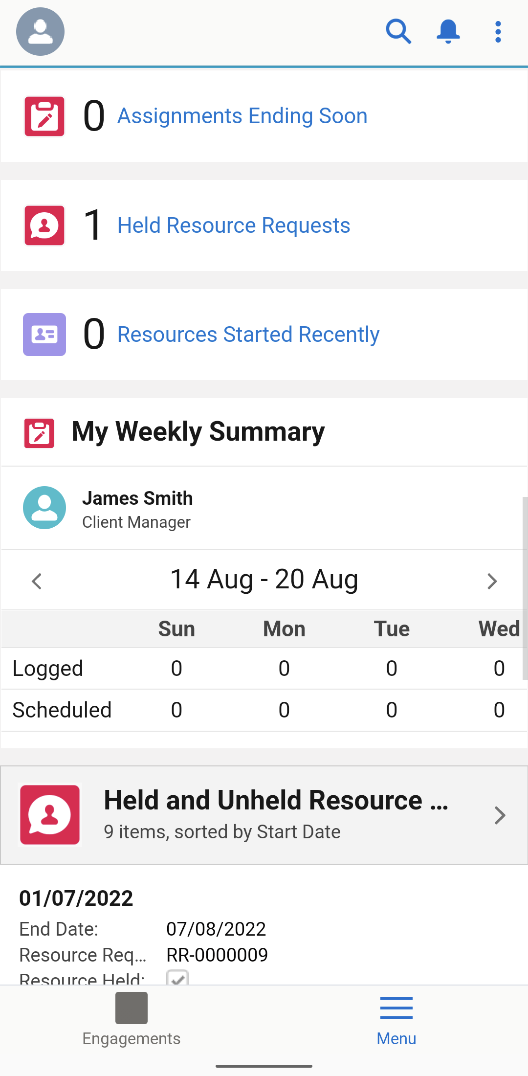 Your administrator can customize the Assignments Ending Soon, Held Resource Requests and Resource Started Recently count cards using the Lightning App Builder, for more information, see Setting up Certinia Count Cards.