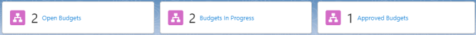 | In Progress Budgets | The count of the total number of budgets with the status of 'In Progress'. | Displays a list view of the number of budgets with the status of In Progress. |