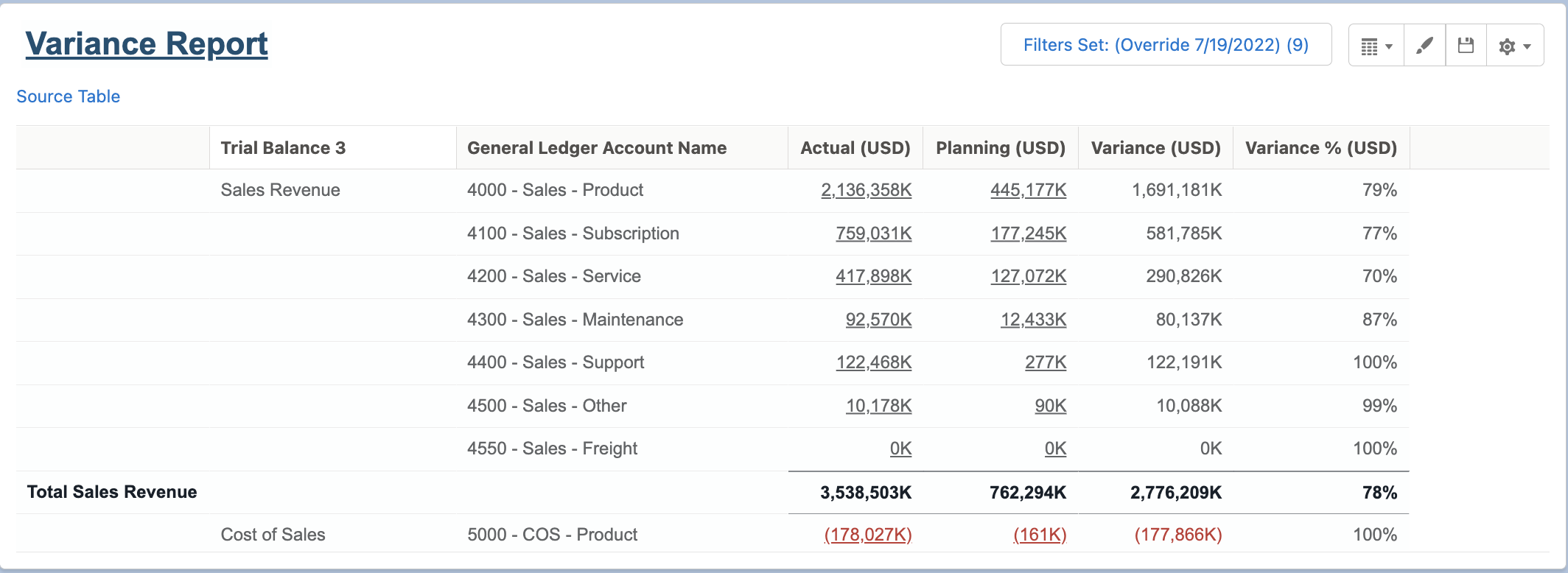 The Variance Report Record allows you to view and configure the reports created with the PlanningWorkspaceLensProfile. The Variance Report Records is built with Financial Report Builder and shows a comparison between actual and planned budgets using Accounting and Planning and Analysis data.