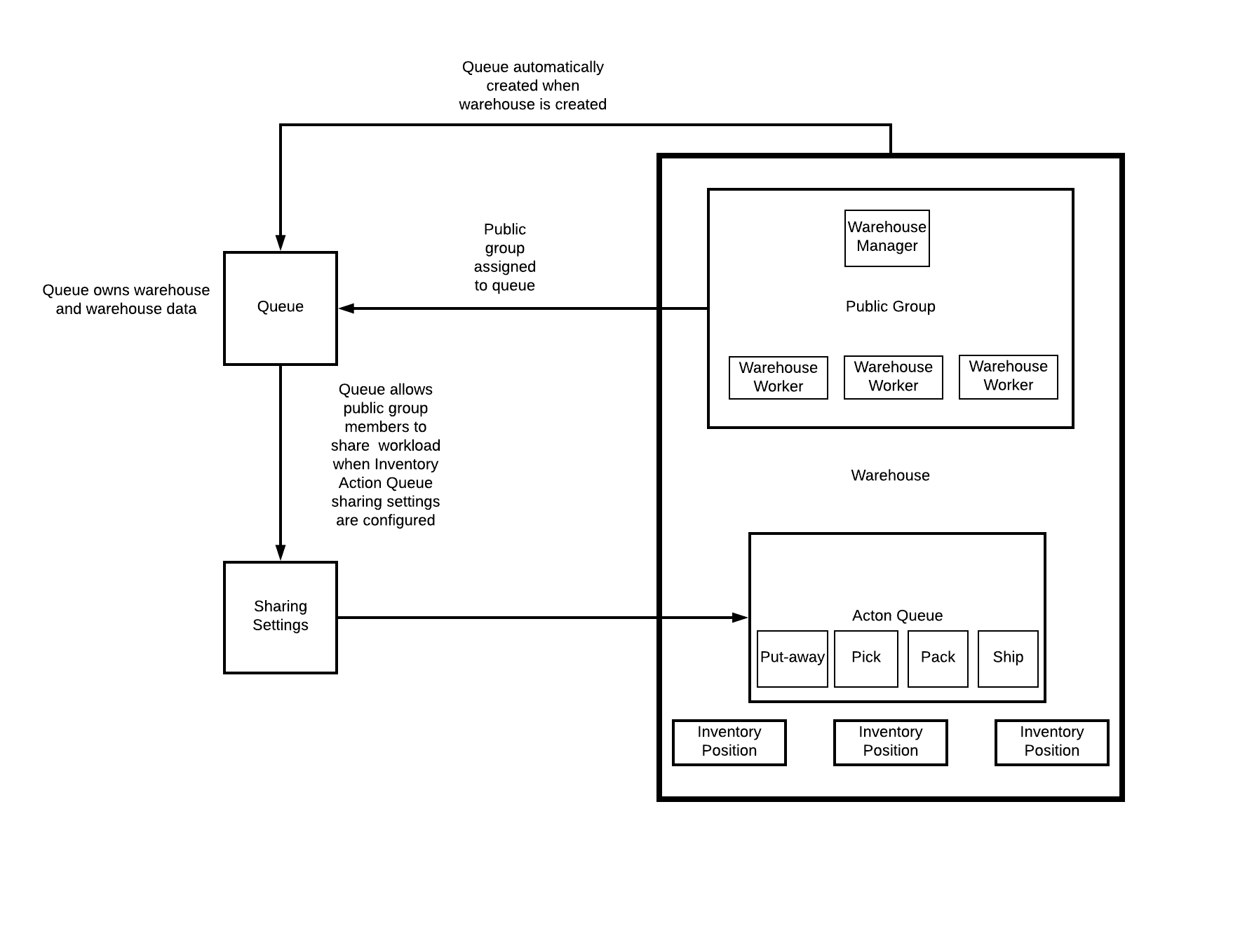 When you create a warehouse, a queue is automatically created for that warehouse and assigned as the owner of the warehouse. It is possible to add individuals to a queue but we recommend you add a group to a queue so that the appropriate sharing rules can be configured. A queue allows groups of users to manage a shared workload more effectively. You can select which objects to include in the queue, for example, the Inventory Action Queue.