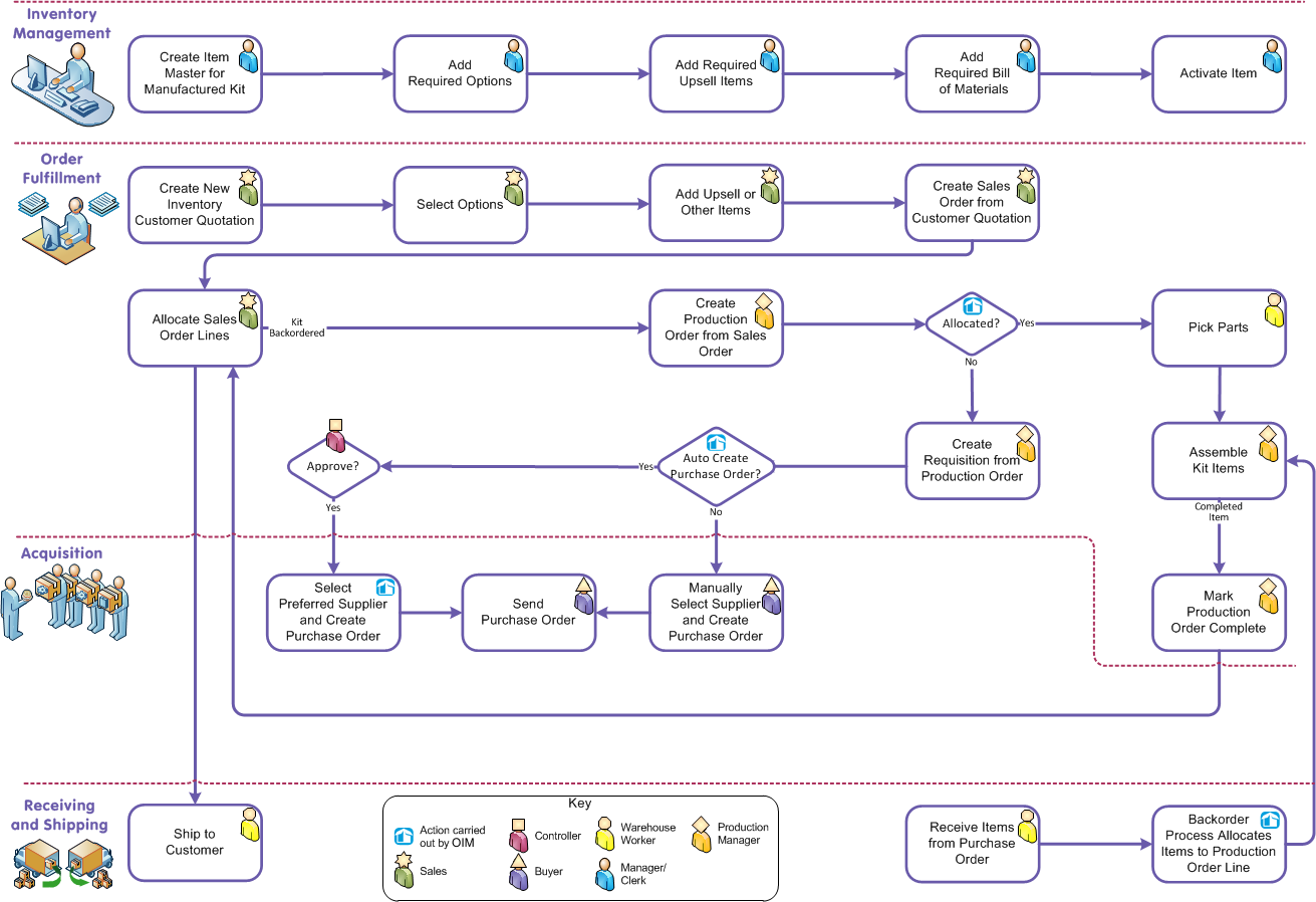 You can convert a configured item to a production order and schedule it for assembly. The diagram that follows shows an example workflow that uses this functionality.