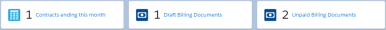 Your administrator can customize the Contracts Ending This Month, Draft Billing Documents, Unpaid Billing Documents count cards using the Lightning App Builder. For more information, see Setting up Certinia Count Cards.