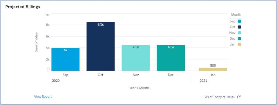 The Projected Billings Report Chart displays the value of your Contracts and Contract Line Items with Billing Schedules, summarizing the value of your billings by month and year.