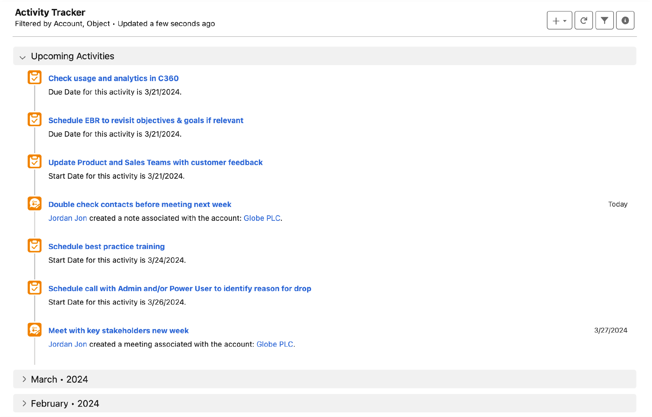 Activity Tracker enables you to view past and upcoming activities and create new tasks and CS activities.