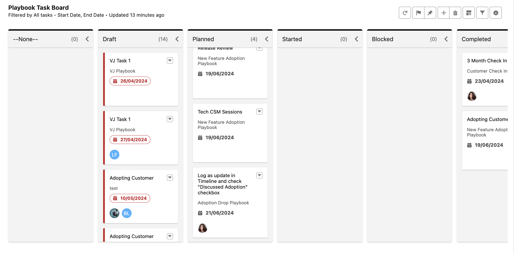 KPI cards provide you with information to highlight important details about your playbooks, objectives, success plans and tasks. To display a list of detailed records specific to each card, click the blue title link.
