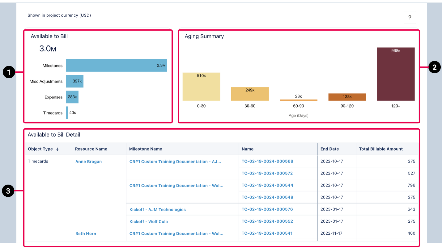 - View the total value available to bill for your project. This is a sum of timecards, milestones, expenses, and miscellaneous adjustments that are billable but have not yet been billed to the customer.